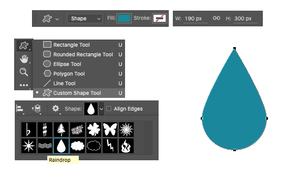 让我们给柠檬汽水加更多的细节吧:一片新鲜的薄荷叶。 选择自定义形状工具(U),在顶部的控制面板的下拉形状菜单中选择雨滴形状,