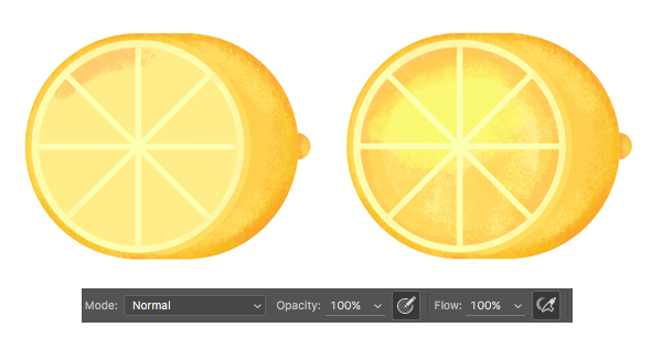 现在我们给柠檬片也同样添加纹理。 给柠檬片图层也添加链接图层,选择从深橙色到亮黄色的颜色用纹理笔刷涂抹。